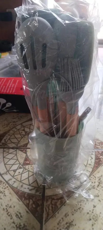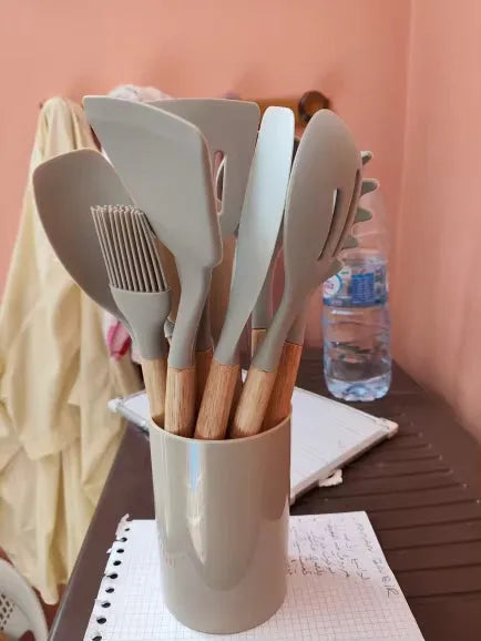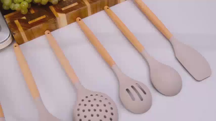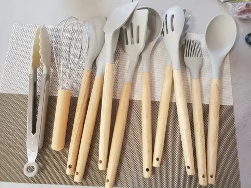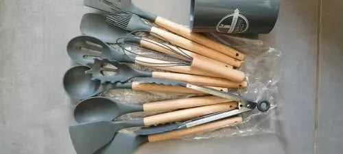 Nasz zestaw silikonowych narzędzi kuchennych jest starannie wykonany dla tych, którzy kochają zarówno gotowanie, jak i styl. Materiały odporne na ciepło zapewniają, że narzędzia nie odkształcą się ani nie stopią, a powierzchnia nieprzywierająca ułatwia obracanie i przewracanie potraw. Ich eleganckie drewniane uchwyty zapewniają wygodny chwyt i dodają odrobinę wyrafinowania do wystroju kuchni. Niezależnie od tego, czy jesteś profesjonalnym szefem kuchni, czy domowym kucharzem, te przybory są zaprojektowane, aby z łatwością i elegancją spełniać wszystkie Twoje potrzeby kulinarne. Niezbędny dodatek dla każdego, kto chce ulepszyć swoje doświadczenia kuchenne.