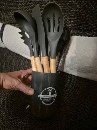 Obecnie zestaw silikonowych narzędzi kuchennych jest oferowany w klasycznym połączeniu czerni i naturalnego drewnianego uchwytu, dodając ponadczasowej elegancji do Twojej kuchni.